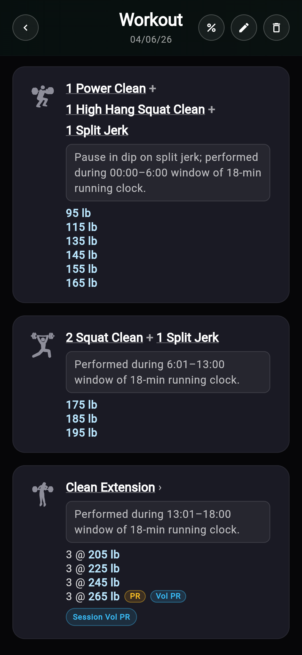 - First-class complexes — log complexes like "1 Power Clean + 1 High Hang Squat Clean + 1 Split Jerk" as single session cards with movement names joined by "+".