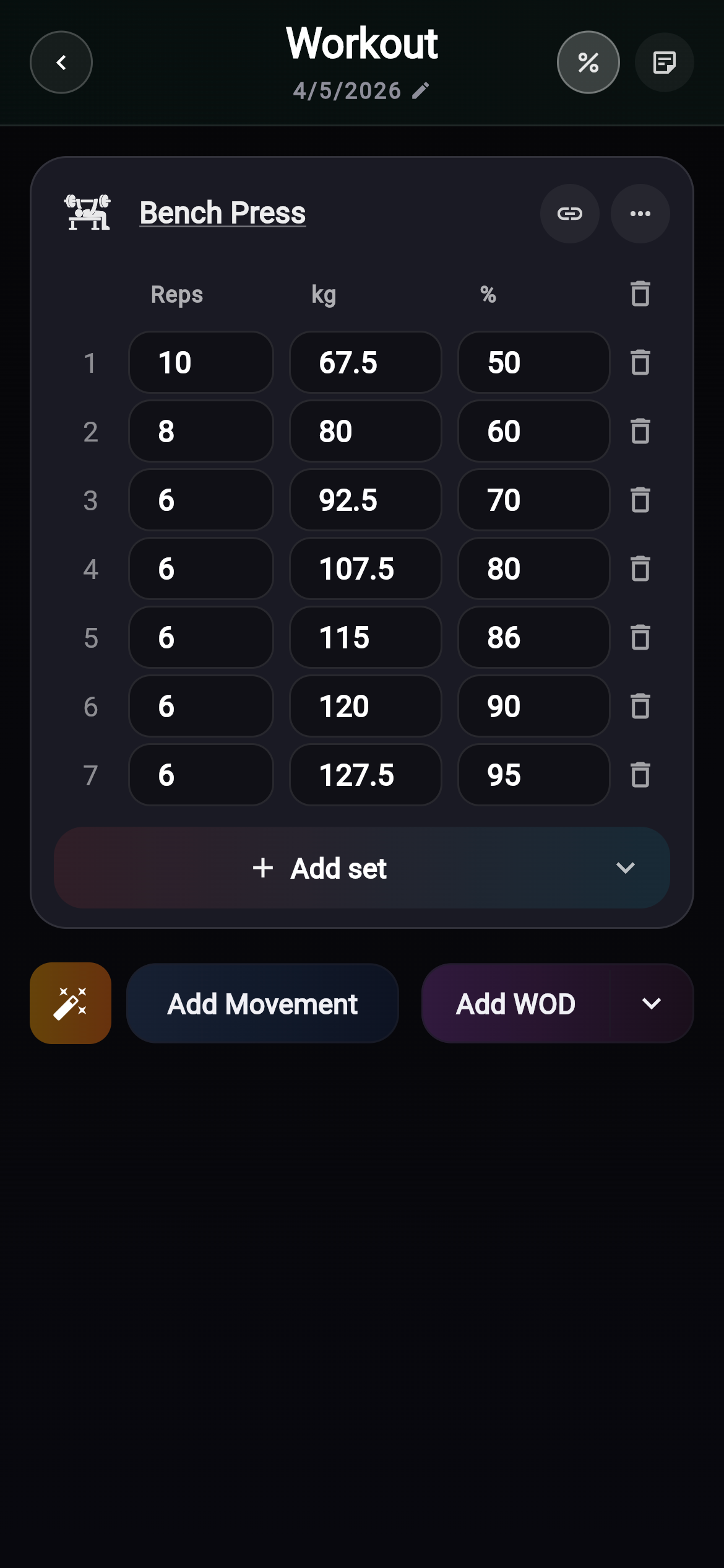 - Bi-directional %1RM column — type a weight to see the percentage of your estimated 1RM, or type a percentage to compute the weight. Works in both kg and lb.