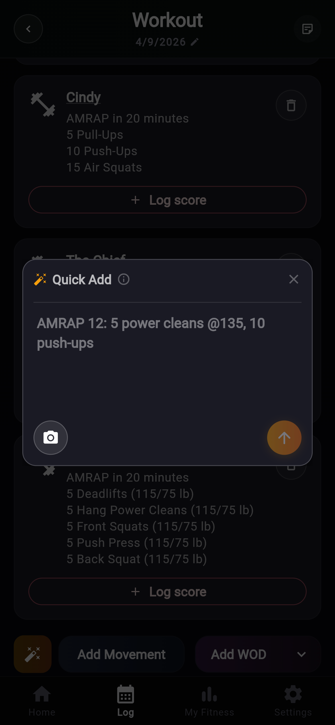 - Free-form text parsing — open the Quick Add sheet from the log workout screen, type something like "AMRAP 12: 5 power cleans @135, 10 push-ups", and PRzilla's AI parses it into structured movements and WOD scores.