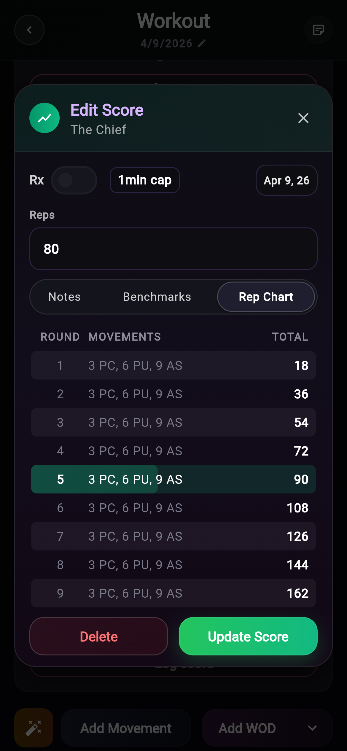 - Rep Chart tab — new tab in the Edit Score dialog showing round-by-round movement breakdown with running totals; highlights the active round based on your entered rep count.